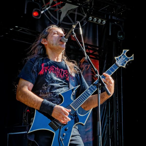 Le concert commence et dès le premier morceau « Skeltons Of Society » (alors non, ce n’est pas une reprise de SLAYER) et malgré une glace dans une main, une bière dans l’autre et quelques objets connectés, c’est plus fort que moi, il faut que je m’approche !